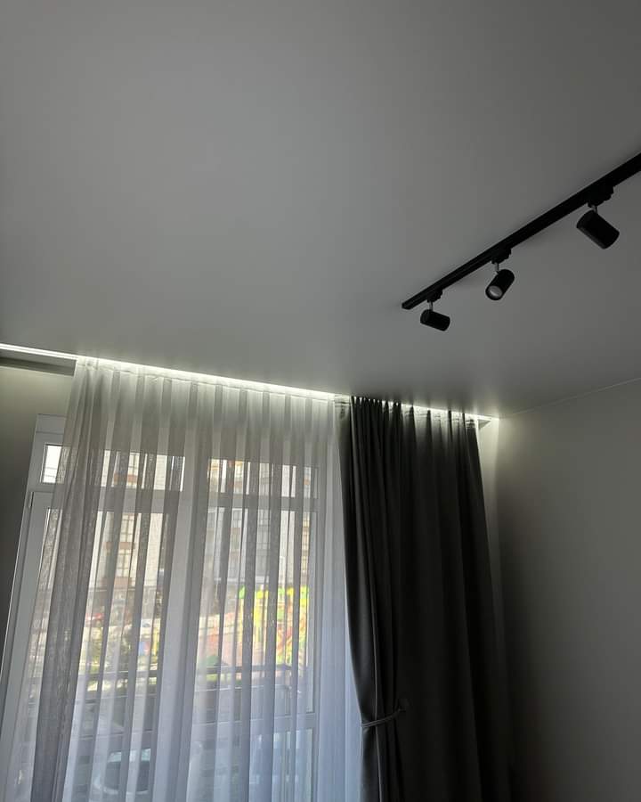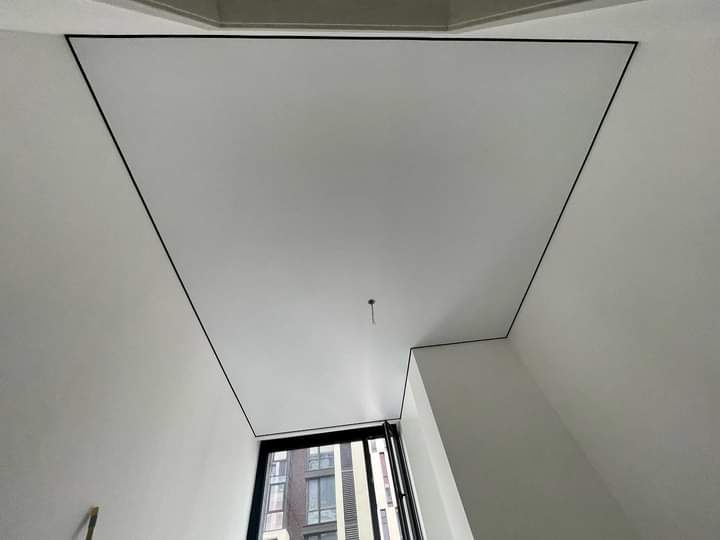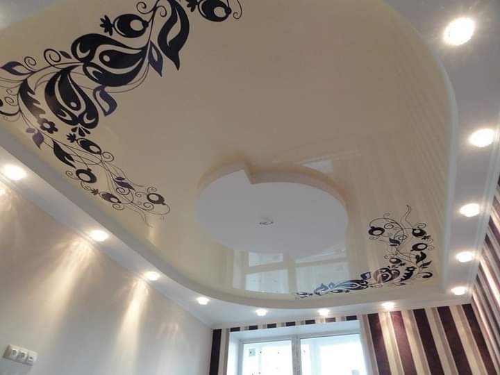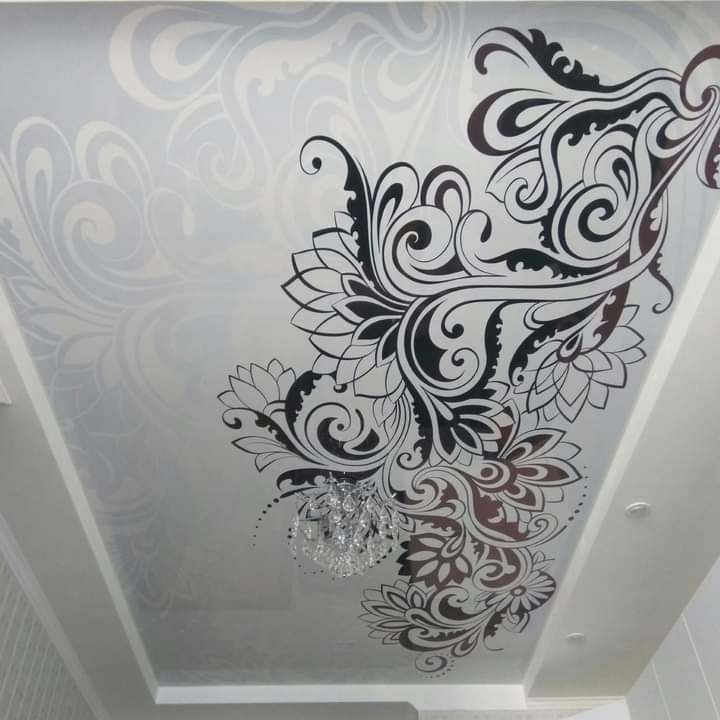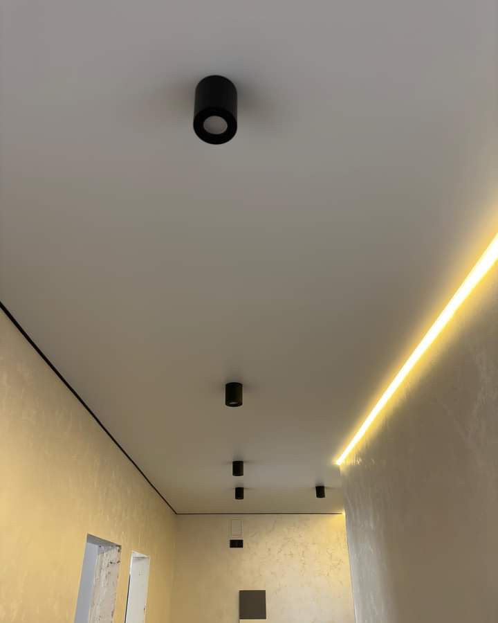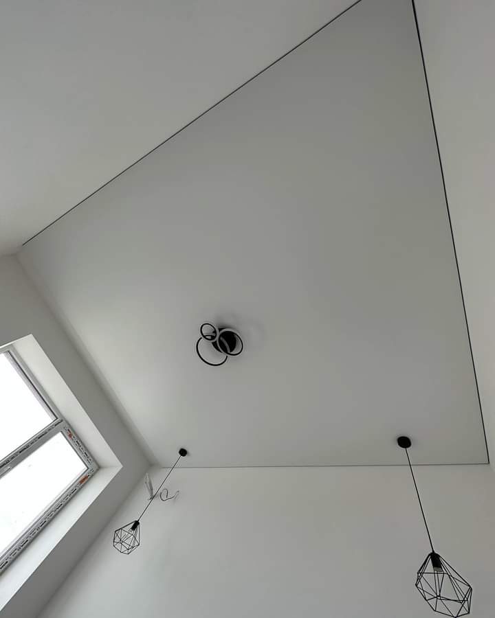 Тіньові натяжні стелі характеризують примикання натяжної стелі до стіни - це такий спеціальний тіньовий зазор по периметру стелі, який робить чіткий стильний контур. Це новий тренд в дизайні стель, тому варто його використати, якщо у вас в інтер'єрі плануються чорні світильники чи інші елементи чорного кольору. Саме полотно може бути яке завгодно: матове, сатинове,глянцове чи з фотодруком.