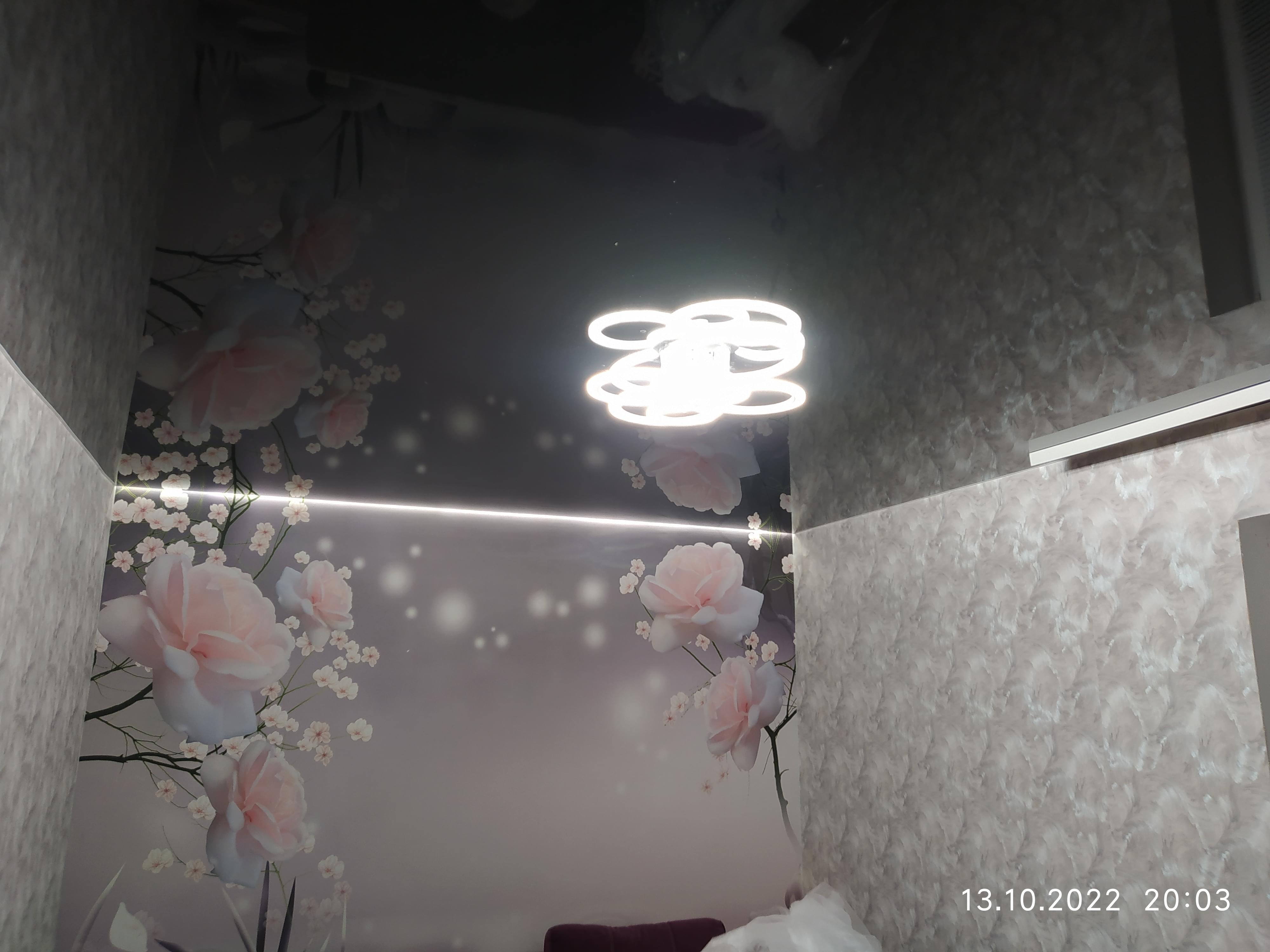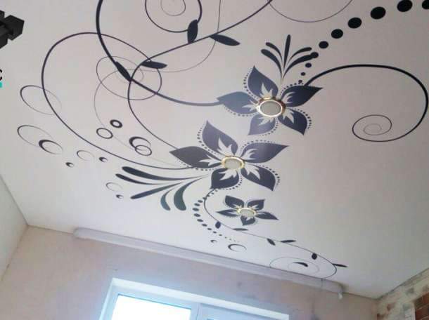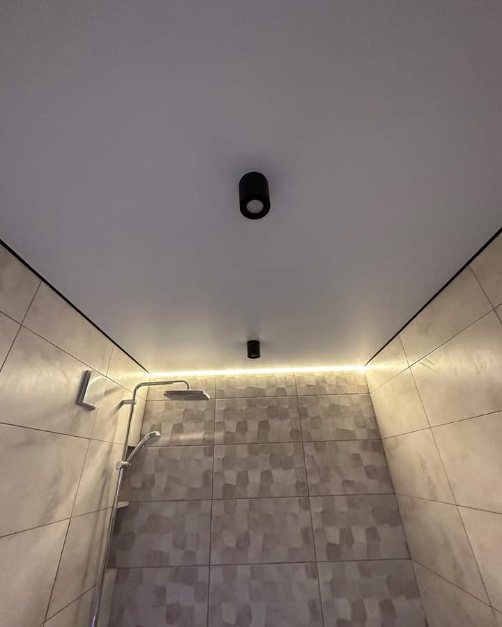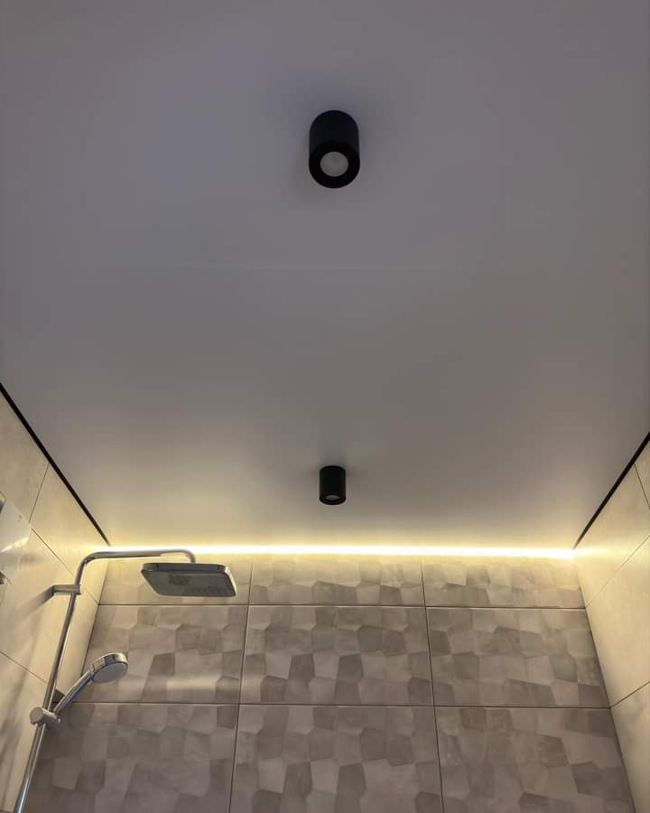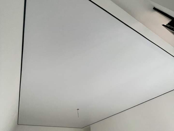 Тіньові натяжні стелі характеризують примикання натяжної стелі до стіни - це такий спеціальний тіньовий зазор по периметру стелі, який робить чіткий стильний контур. Це новий тренд в дизайні стель, тому варто його використати, якщо у вас в інтер'єрі плануються чорні світильники чи інші елементи чорного кольору. Саме полотно може бути яке завгодно: матове, сатинове,глянцове чи з фотодруком.